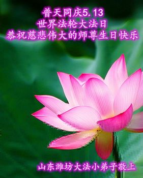 今年的5月13日,是师尊传法二十三周年暨师尊六十四华诞纪念日。 此时,我对师尊的感恩已化作泪水,一人炼功,全家受益。弟子全家沐浴在师尊的浩荡佛恩中。法轮大法使我的家庭变的和睦,全家身体健康。弟子只感到时间更紧迫,更加珍惜这正法的最后时间,做好三件事,去净人心随师还。 叩拜师尊! 潍坊市寒亭区教育系统大法弟子 2015年5月5日 山东潍坊大法弟子恭祝慈悲伟大的师尊生日快乐!庆祝世界法轮大法日!