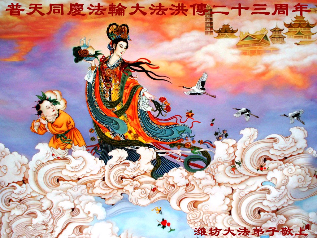 仰望师尊的法像金光闪闪, 弟子感恩的泪水似珍珠滚到胸前, 衣襟已浸透像珍珠镶嵌, 虔诚感恩的话语倾尽苍穹的语言! “五•一三”整个大穹盛大的节日—— 师尊华诞、大法开传。 众穹体佛、道、神鼓乐喧天, 同咏诵齐歌舞师尊的恩典。 创世主啊!我伟大慈悲的师尊: 是您把大法徒从旧宇宙中捞起, 消除了罪业又送到了新的宇寰。 我们一切的一切是您创造, 所有的众生是师尊让他们生还。 徒儿泪水潸潸无以回报, 只有精進做好三件事, 不辜负下世的洪愿。 在神的路上跟上师尊正法的步调, 做您的徒儿无比的荣幸殊胜再无遗憾! 创世主啊!我崇敬爱戴的师尊, 五体投地跪拜在您的脚下, 虔诚的祝福师尊华诞快乐! 庆祝五一三大法洪传二十三周年! 山东潍坊大法弟子恭祝5.13世界法轮大法日!恭祝慈悲伟大的师尊生日快乐!