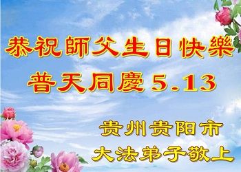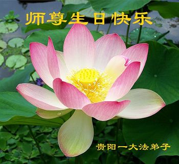 今年的5月13日是师尊64岁华诞,又是世界法轮大法日,我们贵阳学法小组全体大法弟子以无限的敬意恭祝师尊生日快乐!法轮大法好!真善忍好!在这普天同庆同祝的大喜日子,表达我们共同的心声:师父辛苦了!我们想念师父!祝师父生日快乐!回顾这十多年的正法修炼路,在师父的慈悲呵护下,我们走到了今天,千言万语难以表达对师尊的感恩,今后我们要更加精進做好三件事,努力完成历史赋予的使命,修炼如初,稳健的走完最后这段路,配当和师父同在正法时期大法弟子的光荣称号,用实际行动来庆祝一年一度的世界法轮大法日。 贵州贵阳市全体大法弟子恭祝慈悲伟大的师尊生日快乐!庆祝世界法轮大法日暨大法洪传二十三周年!