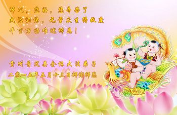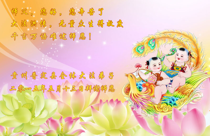 请师父放心,弟子一定要做好三件事,修正好自己,跟师父回家。 贵阳市三桥片区大法弟子 2015.5.5 贵州遵义大法弟子母女恭祝慈悲伟大的师父生日快乐!普天同庆世界法轮大法月!