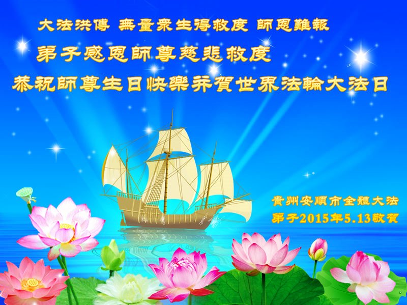 【明慧网二零一五年五月十日】 贵州安顺市全体大法弟子恭祝师父生日快乐并贺世界法轮大法日!