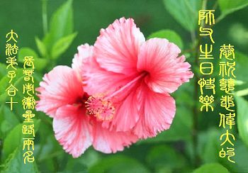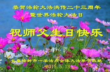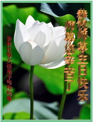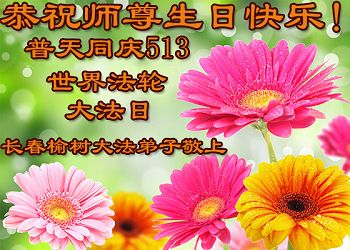 敬祝师尊好,法轮大法好 一年又一年,喜迎五一三 师尊华诞日,仰问师父好 是您带来了宇宙大法 真善忍 让法的光芒照遍苍宙 挽救了万物,众生天地 唤醒了弟子们尘封已久的记忆 证实了法轮大法的神圣与超常 呵护着弟子们从磨难走到今日 沐浴在师尊佛恩浩荡之中 弟子唯有做好三件事修好自己 救度众生 助师正法挽救众生苍宇 展现大法的美好和威力 在这普天同庆的日子里 弟子们千言万语一句话 敬祝师尊好,法轮大法好 长春天浴全体弟子 吉林省长春榆树市大法弟子恭祝师尊生日快乐!