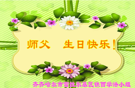 黑龙江省齐齐哈尔市富拉尔基区铁西学法小组大法弟子恭祝师父生日快乐!