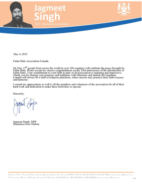 安省新民主党副党领、省议员辛格(Jagmeet Singh)已经连续多年为法轮大法日发出贺信。在今年的贺信中,辛格议员说:“在五月十三日,全世界一百多个国家和地区的人们将共庆法轮大法所带来的和平。请接受我对法轮大法传世二十三周年庆典的最诚挚祝贺。” “尽管面对迫害,你们对自己信仰的坚持是那么启迪人心和令人赞叹。谢谢你们与安省民众和全加拿大的民众分享你们的功法和传统。” 贺信中说:“加拿大将永远是信仰多元化的乐土,在这里每一个人都可以和平地追求自己的信仰。” “我衷心地感谢法轮大法学员和义工们的辛勤工作和奉献,让庆祝活动如此特别。” 安省省议员:“真善忍”为民众树立榜样  安省省议员Harinder Malhi的贺信 |