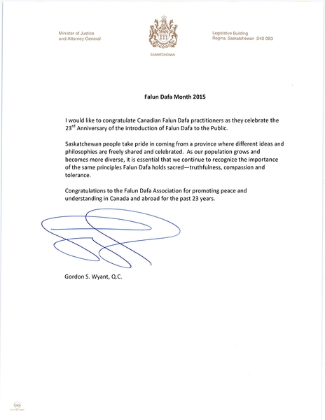 安省省议员杰克‧麦克拉伦(Jack MacLaren)在贺信中说:“我代表安省进步保守党内阁,向所有庆贺法轮大法洪传二十三周年的朋友们致以最诚挚的问候。” “李洪志先生创立的法轮大法以‘真、善、忍’为基本原则,弘扬宽容与平和。” “世界各地都有这一和平功法的修炼者,安省也是其中之一。加拿大法轮大法学会积极弘扬功法,帮助人们获得更健康充实的人生,你们所做的工作非常卓越。” 贺信最后写道:“我诚挚祝愿你们再接再厉,使法轮大法理念在本省居民中得以弘扬。” 萨省司法厅长:祝贺法轮大法修炼者  萨省司法厅长、省议员怀恩特的贺信 |