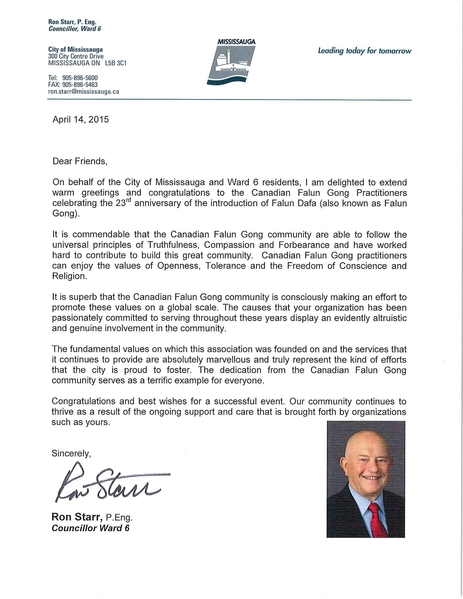 大多伦多地区万锦市第五区市议员科林‧坎贝尔(Colin Campbell)发来贺信说:“在法轮大法洪传世界二十三周年庆典之际,我很高兴可以送上我的祝福。” “我非常支持法轮大法学会在社区内为促进和睦、宽容和善良所做出的努力。自一九九二年公开传出,法轮大法也因此而受到公认,约一亿人受益于修炼法轮大法。” “万锦市是加拿大最多元化的城市,我们的四个社区因和平、谐同和宽容理解而繁荣。法轮大法推崇‘真、善、忍’的理念使这些重要的特性在我们的社区以至整个社会得以传播。” 坎贝尔议员在贺信中还说:“请接受我对所有法轮大法修炼者、支持者、家人以及朋友的真诚祝福,祝你们拥有一个充满欢乐且难忘的庆典月。法轮大法将继续启迪着、帮助着构建友好的社区。” 密西沙加市议员:法轮大法修炼人是绝佳榜样  密西沙加市第六区市议员斯塔的贺信 |