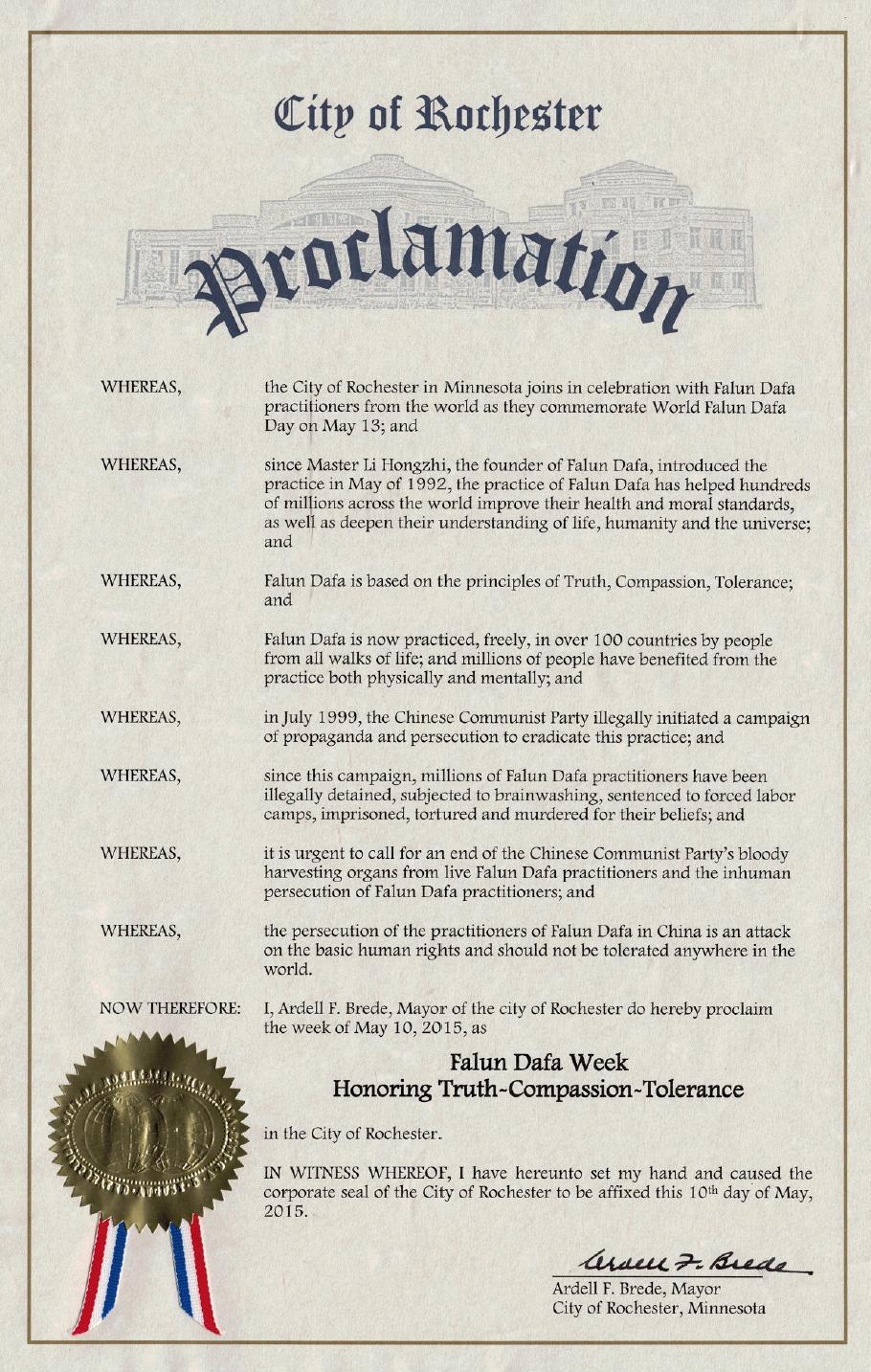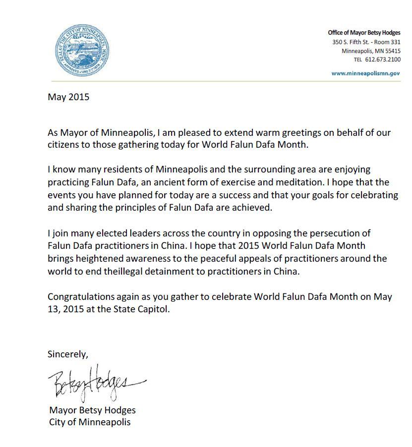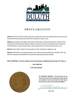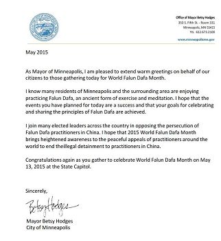 | 【明慧网二零一五年五月十日】第十六届世界法轮大法日来临之际,美国明尼苏达州多个城市的市长发来贺信或颁发褒奖,赞扬法轮大法“真、善、忍”的理念,并宣布法轮大法日或法轮大法周。 明尼阿波利斯市市长祝贺法轮大法弘传 明州第一大城市——明尼阿波利斯市(Minneapolis)市长发来贺信,代表本市的居民向庆祝法轮大法月的民众表示热烈的祝贺。他在信中说:“我知道明尼阿波利斯及周边地区的许多民众喜爱修炼法轮大法——这一古老的健身及修行方法。我祝愿庆祝活动圆满成功,祝愿你们庆祝及分享法轮大法理念的目的圆满达成。” “我和全国的民选领导人一道,反对发生在中国的对法轮大法修炼者的迫害。我希望二零一五年的法轮大法月会引起对法轮功学员和平呼吁的高度关注,以结束在中国的对法轮功学员的无理关押。” “再一次祝贺法轮大法月将于二零一五年五月十三日在州府的庆祝。” 罗切斯特市褒奖法轮大法 明州第三大城市罗切斯特市(Rochester)市长颁发褒奖,赞扬法轮大法给人们带来的健康和道德水平的提高,谴责中共对法轮大法的迫害,并宣布法轮大法周。褒奖译文如下: 鉴于,明尼苏达州罗切斯特市加入全世界法轮大法修炼者共同庆祝五月十三日的世界法轮大法日; 鉴于,法轮大法自一九九二年五月由李洪志大师传出后,法轮大法给全世界上亿人带来健康和道德水平的提高,并加深了人们对生命,人类,及宇宙的理解; 鉴于,法轮大法基于真、善、忍; 鉴于,全世界超过一百多个国家和地区的民众在自由地修炼法轮大法,上亿人得到身心的改善。 鉴于,自迫害开始,上百万法轮大法修炼者因为他们的信仰被非法拘留,洗脑,劳改,监禁,酷刑,杀害; 鉴于,一九九九年七月,中国共产党非法发动造谣宣传和迫害,企图禁止法轮大法; 鉴于,需要立即制止中共对法轮大法修炼者血腥的活摘器官和残酷迫害; 鉴于,中共对法轮大法的迫害是对基本人权的践踏,是何时何地都不可容忍的。 因此,现在,我,阿戴尔•布雷迪,罗切斯特市市长,为褒奖真善忍,宣布二零一五年五月十日这一周,为罗切斯特市市的法轮大法周。 迪庐斯市褒奖法轮大法 明州第五大城市迪庐斯市(Duluth)市长也颁发褒奖,宣布二零一五年五月十三日为迪庐斯市的法轮大法日。褒奖译文如下: 鉴于,明尼苏达州迪庐斯市加入全世界法轮大法修炼者共同庆祝五月十三日的世界法轮大法日; 鉴于,法轮大法自一九九二年五月由李洪志大师传出后,法轮大法给全世界上亿人带来健康和道德水平的提高,并加深了人们对生命,人类,及宇宙的理解; 鉴于,法轮大法基于真、善、忍; 鉴于,全世界超过一百多个国家和地区的民众在自由地修炼法轮大法,上亿人得到身心的改善。 因此,现在,我,丹•乃斯,迪庐斯市市长,正式宣布二零一五年五月十三日这一天,为迪庐斯市的法轮大法日。