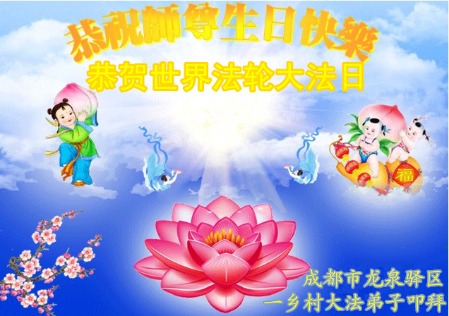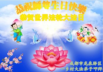 【明慧网二零一五年五月十一日】 四川省成都市龙泉驿区一乡村大法弟子恭贺世界法轮大法日!恭祝师尊生日快乐!