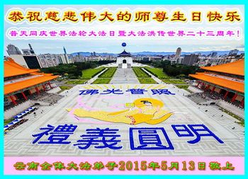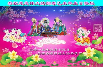 【明慧网二零一五年五月十一日】 昆明市西山区一学法小组大法弟子恭祝师尊生日快乐!