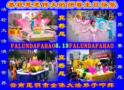 云南昆明市全体大法弟子恭祝慈悲伟大的师尊生日快乐!庆祝世界法轮大法日暨大法洪传二十三周年!