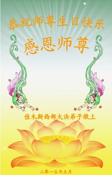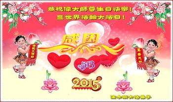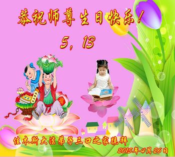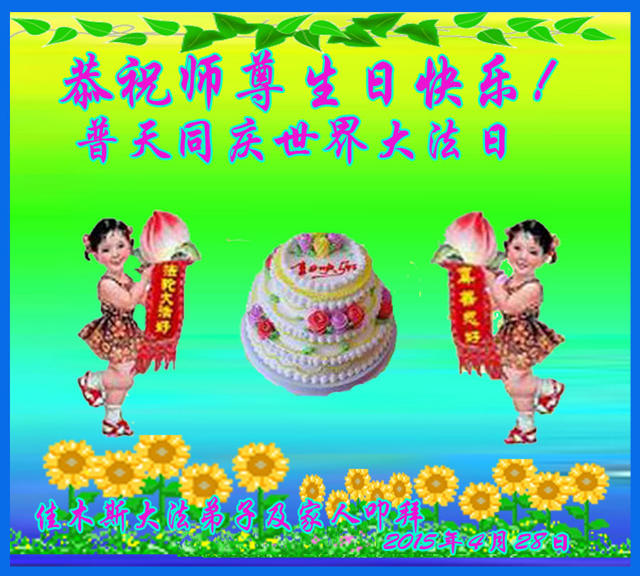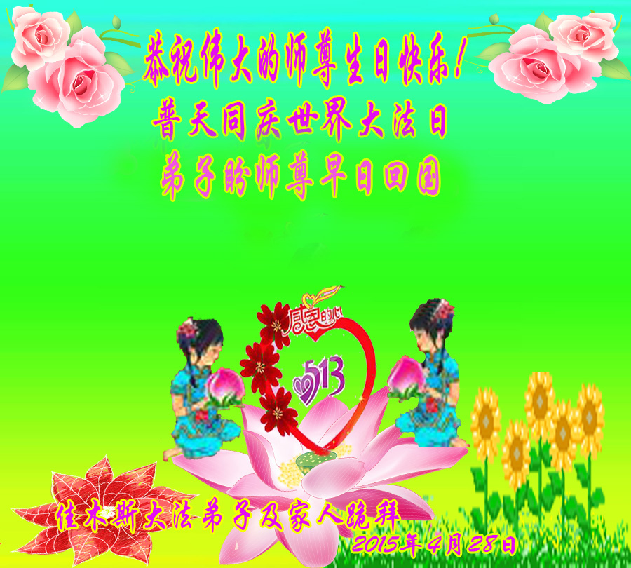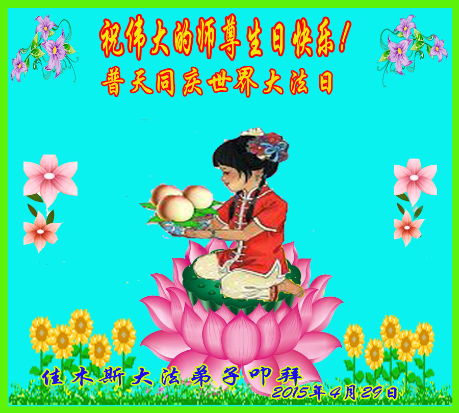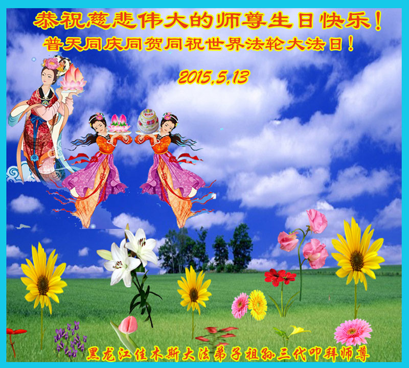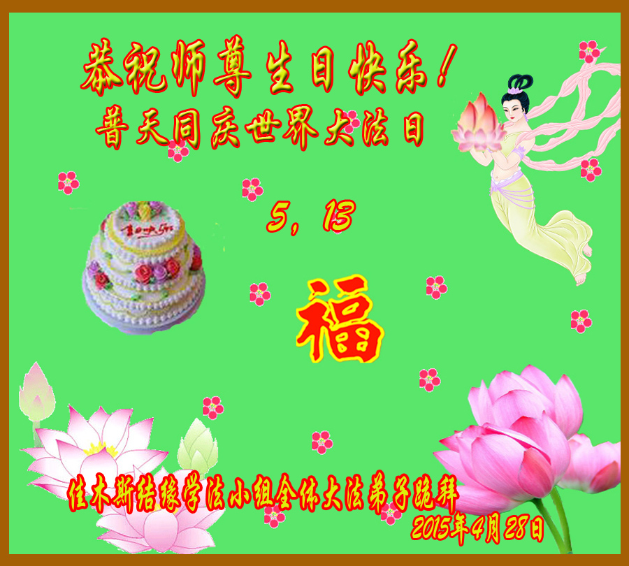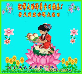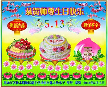 【明慧网二零一五年五月十一日】 黑龙江省佳木斯地区新宇学法组全体大法弟子恭贺师尊生日快乐!