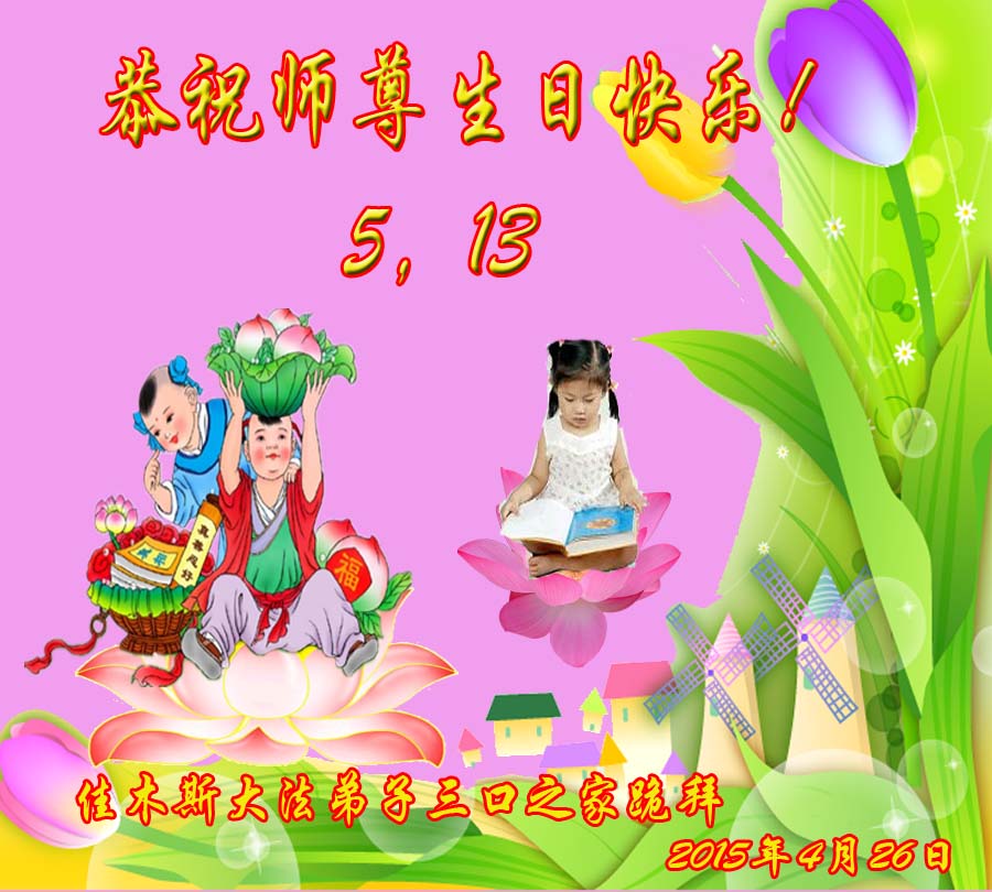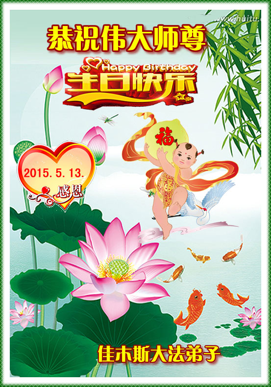 弟子坚信大法,听师父的话,遇事向内找,做好三件事,多救人,谢谢师父的苦度。 我代表全家人向慈悲伟大的师父叩拜 佳木斯大法弟子及全家叩拜 2015年5月4日 黑龙江省佳木斯一夫妻大法弟子恭祝慈悲伟大的师尊生日快乐!同庆世界法轮大法日!