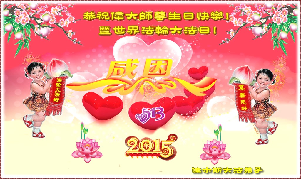 庆祝世界法轮大法日 五一三 新纪元 大主佛 来人间 五一三 不平凡 正大穹 法轮转 五一三 天地欢 命改变 人神赞 师慈悲 挽巨难 众罪业 一身担 救度人 返家园 救众生 上法船 师辛苦 徒泪泉 大法徒 真修炼 救世人 抢时间 史前约 要兑现 修圆满 好回天 九叩拜 师像前 谢师尊 到永远 感师恩 永无限 佳木斯大法弟子 黑龙江省佳木斯大法弟子恭祝伟大师尊生日快乐!
