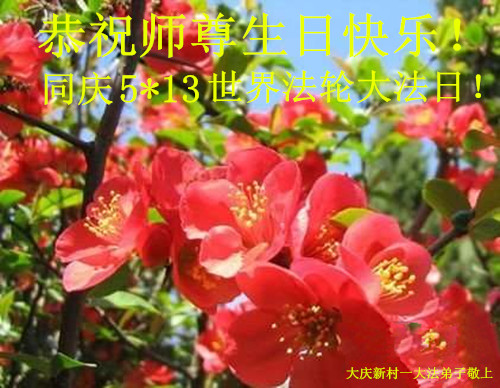 庆祝世界5.13法轮大法日! 大庆广厦、富安、长青大法弟子敬上 黑龙江省大庆东风新村一大法弟子祝师父生日快乐!
