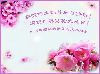 黑龙江省大庆市让胡路区大法弟子恭贺世界法轮大法日暨李洪志师父六十四华诞!祝贺大法洪传二十三周年!