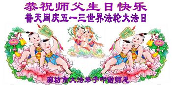 庆贺法轮大法洪传二十三周年! 祝贺第十六届世界法轮大法日! 大法破谜人生悟 返本归真踏征途 风雨路上师呵护 助师正法不停步 河北廊坊大法弟子一家五口敬上 河北省廊坊市大厂县大法弟子恭贺慈悲伟大的师尊生日快乐!