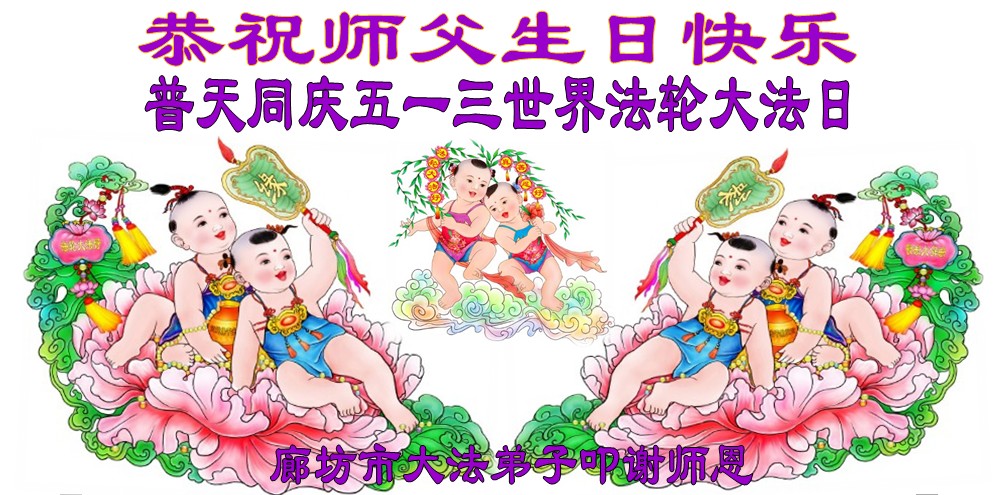 请师尊放心:弟子们一定在正法最后的时间里听师父的话,认真做好三件事正念正行多救人! 河北省廊坊全体大法弟子恭祝师尊生日快乐!暨庆祝5.13世界法轮大法日