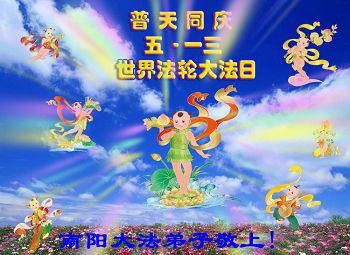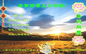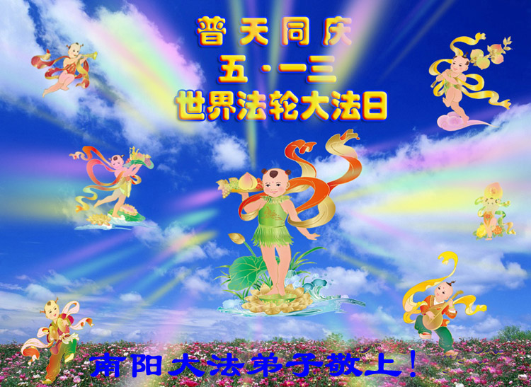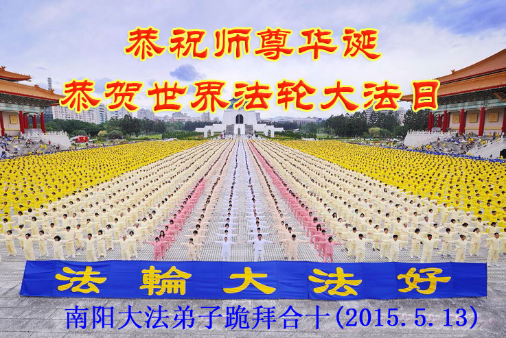 二零一五年的五月十三日即将到来。在此,弟子庆祝法轮大法弘传二十三周年和即将来到的第十六届世界法轮大法日!恭祝师父六十四岁华诞! 师父洪恩救度,弟子唯有更加精進,不失万古机缘,兑现誓约! 河南省汝南县大法弟子 二零一五年五月五日 河南省南阳大法弟子普天同庆五一三世界法轮大法日!