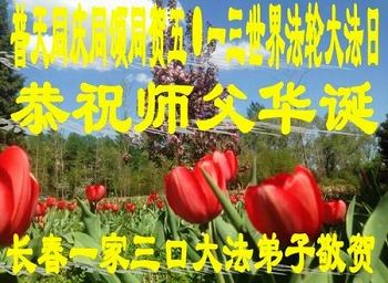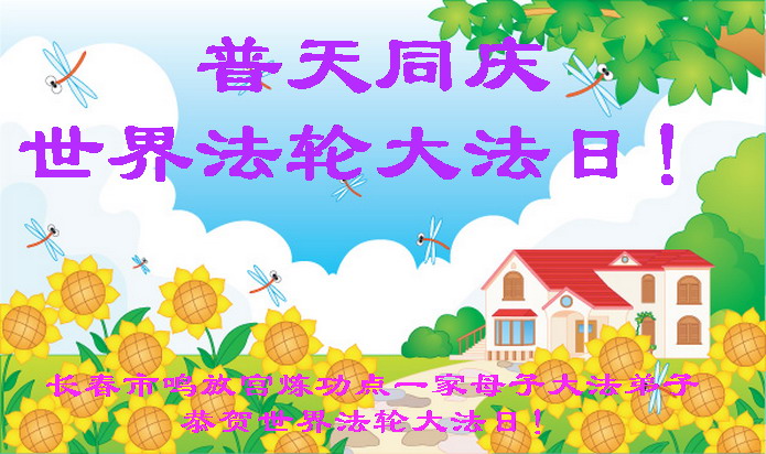 吉林省长春一家三口大法弟子普天同庆同颂同贺世界法轮大法日!恭祝师父华诞!