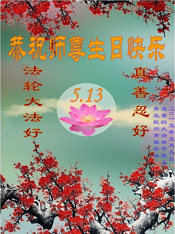 【明慧网二零一五年五月十一日】 山东青岛胶州市被非法迫害的大法弟子恭祝师尊节日快乐!