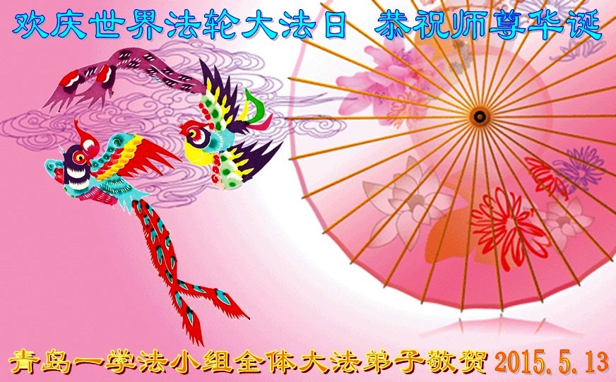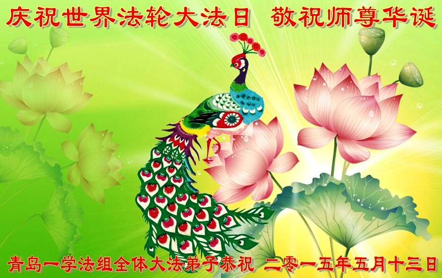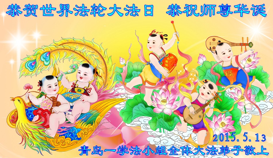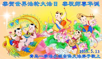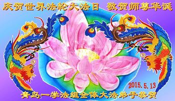 轮回转生为得法, 师尊传法幸得度。 修炼路上有坎坷, 信师信法志不动。 山东青岛市胶州区 一学法小组敬上 二零一五年五月五日 山东省青岛大法弟子恭贺师尊生日快乐!