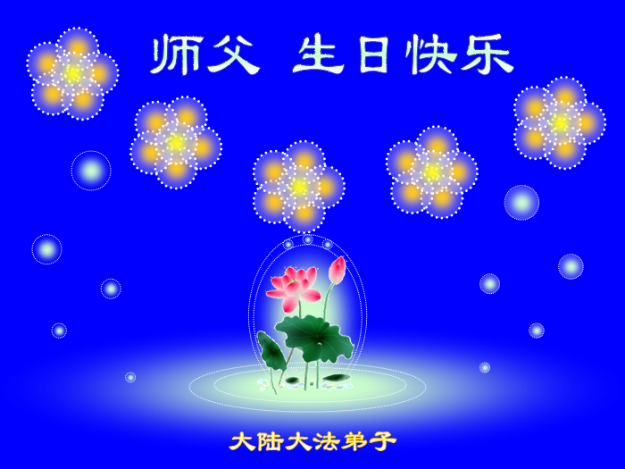 弟子总是被干扰,让师父操心了!希望自己能多添正念,修好自己,多救人! 恭祝师父生日快乐!恭贺第十六届世界法轮大法日!愿江山清明、普天同庆的日子早日到来! 吉林省白城市大法弟子恭祝师尊生日快乐!