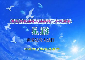 法轮大法弘传世界二十三周年纪念日,暨师尊华诞之际,我们感恩师尊慈悲救度,我们叩首恭祝师尊生日快乐! 沐浴在佛光中的我们无法用语言表达我们对师尊的感恩,唯有精進多救人! 四川广汉二个学法小组全体学员叩拜 吉林省白城大法弟子祝师父生日快乐!并祝贺第十六届世界法轮大法日!