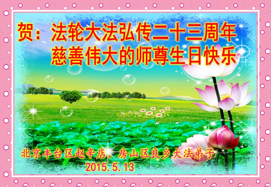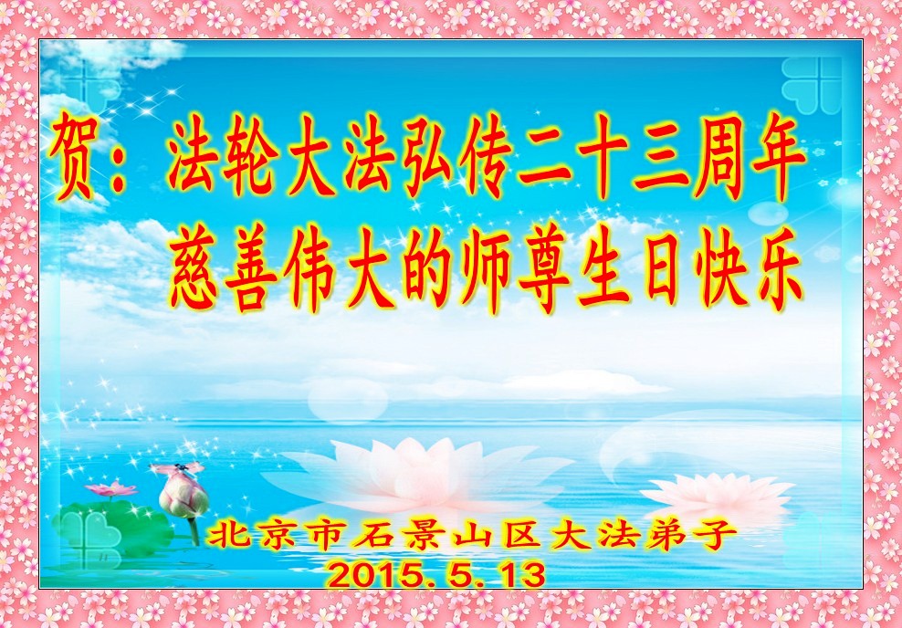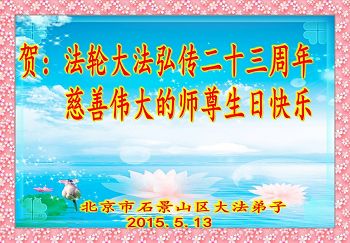 北京市石景山区、丰台区、房山区、东城区大法弟子祝贺法轮大法弘传二十三周年、祝慈悲伟大的师尊生日快乐!