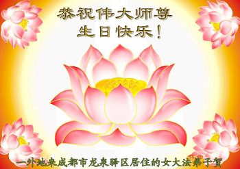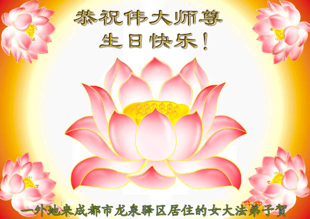 四川省成都市龙泉驿区一从新走回修炼的大法弟子热烈庆祝世界法轮大法日!恭祝恩师生日快乐!