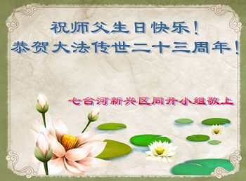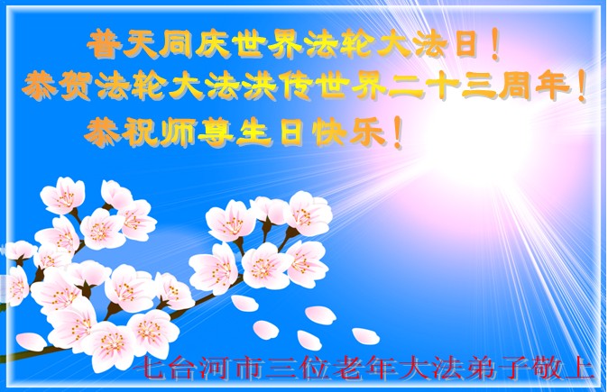 庆祝五月十三日到来的大法洪传二十三周年纪念日暨第十六届“世界法轮大法日”! 黑龙江省七台河一家三口祝师父生日快乐!