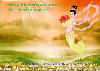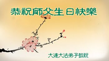 我们一家都是大法的受益者,我们不忘师恩。祝师父生日快乐!恭贺大法传世二十三周年!第十六届“世界法轮大法日”愿更多的有缘人修大法。 七台河一家三口敬上 辽宁省大连大法弟子恭祝师父生日快乐!
