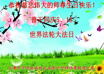 今年我们的节日五月十三日即将来临,心情很激动,此刻先让我们全世界大法弟子共同问候师父节日好!节日愉快! 五月十三日是世界法轮大法日,快到了,大法弟子都知道是师父用巨大的承受给我们延续来的时间,是让我们做好三件事、多救人的,我们是用师父的血泪给我们铺好的路在前進着。邪*党-和魔难挡不住我们救人的步伐。如果我们大法弟子还不抓紧时间救人,就辜负师父对我们的希望,那真是我们永久的遗憾。所以我们这几个老年学法小组今后还要抓紧时间多救人,我们走出去面对面讲真相已有多年了,由不会讲到会讲,由讲少到讲多,现在有的同修一天能劝退一百多人,我们不停步还要多救人。现在网上报道每天三:退.人数十万人左右,我觉得不多,如果每个大法弟子都能重视起来就不是这个数字了。节日我们献给师父的礼物是二个字“真修”,请师父放心我们会做一个合格的大法弟子! 大连沙河口区老年学法小组 天津市大法弟子恭祝师尊生日快乐!