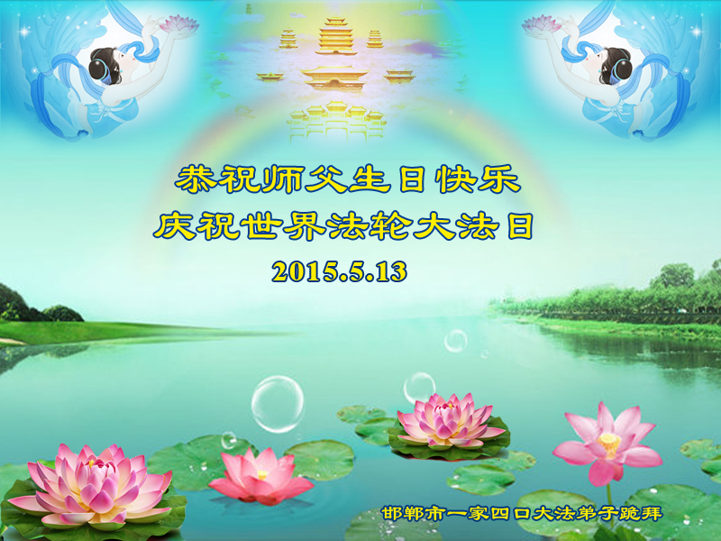 河北省邯郸一家四口大法弟子恭祝慈悲伟大的师尊生日快乐!庆祝世界法轮大法日!