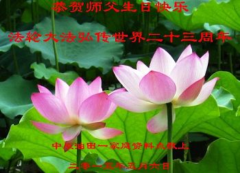 同贺法轮大法洪传世界各地二十三周年!恭祝师尊生日快乐! 辽宁丹东汤池大法弟子恭祝师尊生日快乐!