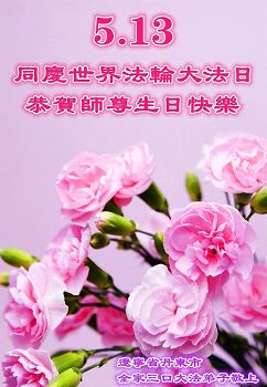 苍宇同贺《五一三》 普天同庆的五一三,盛大、隆重、空前! 佛光普照的五一三,辉煌、神圣、庄严! 因为,救世的大法从此开传! 因为,师尊慈悲正穹救众生出危难! 二十三年啦! 那浩荡的佛恩, 如和煦的春风荡漾在天宇间。 吹生着大地万物, 吹醒了迷智的生命亿万。 似香甜的甘露滋润了无数众生的心田。 那亘古不破的宇宙大法理——“真善忍”的光辉, 照耀着、沐浴了众法徒在返本归真的修炼路上, 不断跨越重重险关和魔难, 在师尊的万般呵护下, 走到今天。 怎能忘啊? 慈悲的师父, 为无量的众生能走出劫难, 为大法徒能修炼圆满。 一再用他那巨大的付出和承受, 拖延着正法的时间。 亲爱的师父: 我们感恩的泪水涟涟, 我们精進的意志更坚。 在大法徒该做的三件事上, 我们会不断添正念。 师父! 今天,在您神圣的华诞之日, 在庆贺世界法轮大法日之时, 我们十二名大法徒, 奉上鲜果佳肴于师尊的法像前, 给您祝寿庆生—— 恭拜师尊生日快乐!再添! 庆祝《五一三》法轮大法日更加辉煌灿烂! 长春大法徒敬上聊表寸心 山东威海水利系统大法弟子恭祝师尊生日快乐!