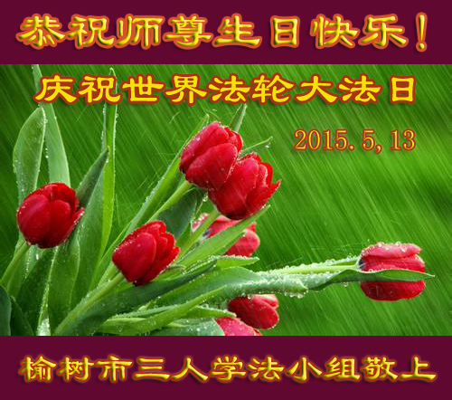 岁月如梭穿时空 师尊诞辰到眼前 感恩师尊传大法 真、善、忍牢记心中 助师正法讲真相 救度迷中世间人 正念正行师佑护 灭尽邪恶癫疯狂 五月十三日师尊生日 鲜花水果敬师前 香烟漂向宙太中 徒儿心中感师恩 师尊救度大慈悲 修心去执报师恩 精進实修不停步 功成圆满随师还 辽河油田大法弟子 大陆一大法弟子恭贺二零一五年世界法轮大法日!
