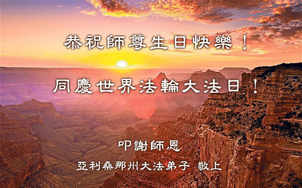师尊您好!我们用人间任何美好的词句都表达不尽弟子对师尊的感恩,我们只有抓紧时间精進实修,做好“三件事”,多救世人,才不负师尊您的慈悲苦度,圆满随师还。 亚利桑那州大法弟子恭祝师尊生日快乐!同庆世界法轮大法日!叩谢师恩!