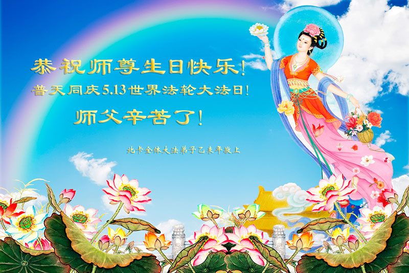 师尊一念正乾坤, 浩荡慈悲度苍生。 穹宇喜迎大法日, 十方同庆谢洪恩。 美国纽约州橙县大法弟子恭贺世界法轮大法日暨师尊华诞!