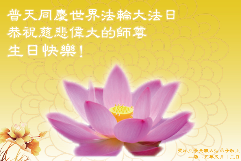 美国德克萨斯州全体大法弟子敬贺 二零一五年五月十三日 美国加州圣地亚哥大法弟子恭祝师尊生日快乐!恭贺世界法轮大法日!