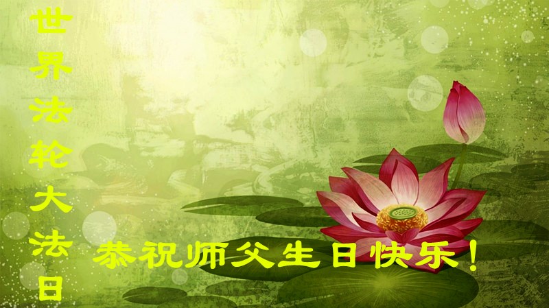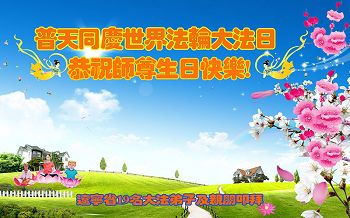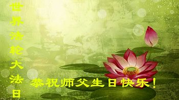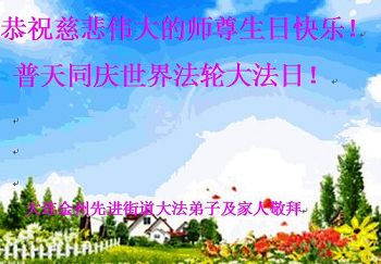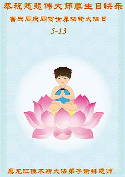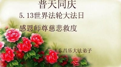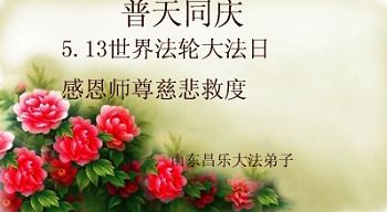 师父您好!历经风雨我们迎来了师父华诞日和又一个世界法轮大法日,在此之际,弟子怀着无比崇敬的心情,向伟大慈悲的师父叩拜,感谢恩师对弟子的慈悲救度与呵护! 山东昌乐大法弟子普天同庆世界法轮大法日!