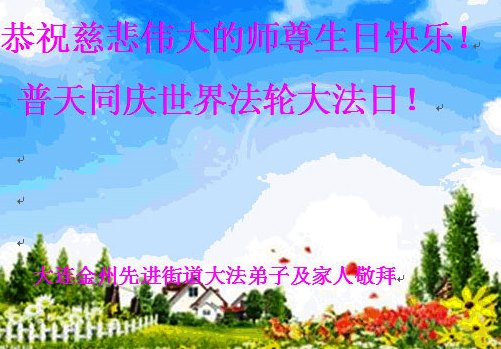 辽宁省大连金州先進街道大法弟子及家人恭祝师尊生日快乐!普天同庆世界法轮大法日!