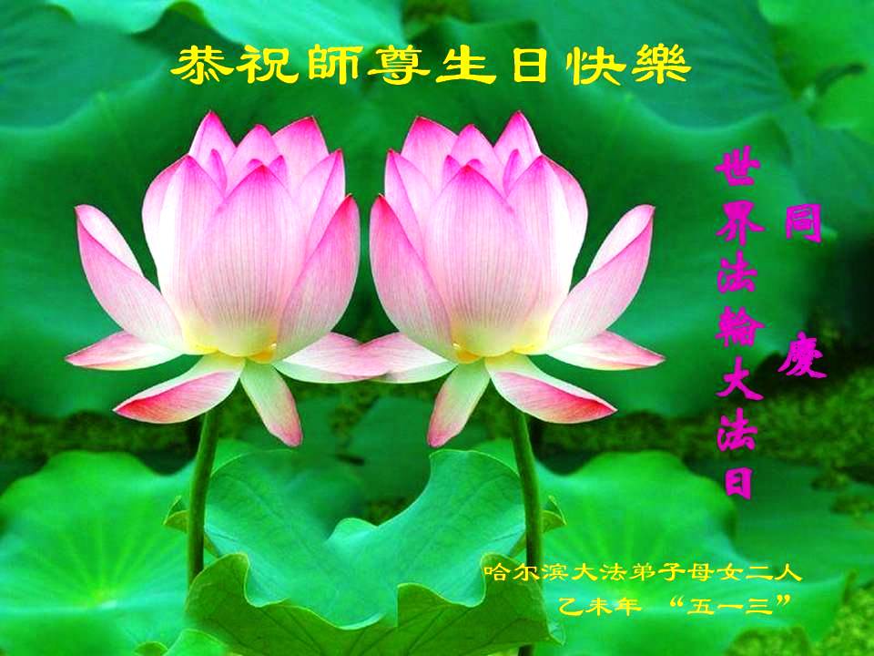 黑龙江省哈尔滨大法弟子母女二人恭祝慈悲伟大的师尊生日快乐!同庆世界法轮大法日!弟子们想念师父!