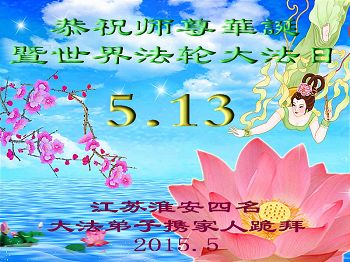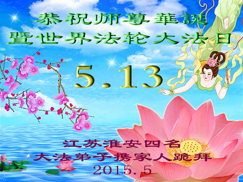 江苏淮安四名大法弟子携家人恭祝慈悲伟大的师尊生日快乐!庆祝法轮大法传世二十三周年!感恩师尊慈悲救度!