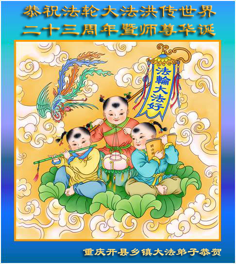感恩师尊 慈悲苦度 大法弟子 谨遵师命 精進实修 广度众生 重庆开县乡镇大法弟子恭祝法轮大法洪传世界二十三周年暨师尊华诞!