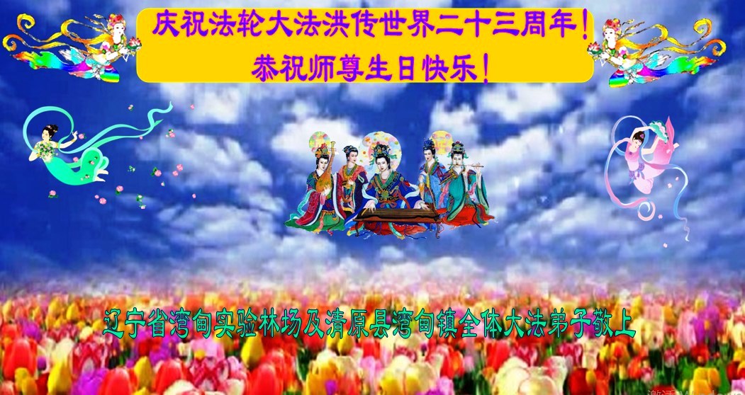 大法洪传 福泽众生 千言万语 师恩难诉 护佑弟子 兑现誓约 村村户户 家家不落 真相广传 谎言揭穿 人人称颂 大法威德 辽宁省湾甸实验林场及清原县湾甸镇全体大法弟子恭祝世界法轮大法日!恭祝师尊生日快乐!