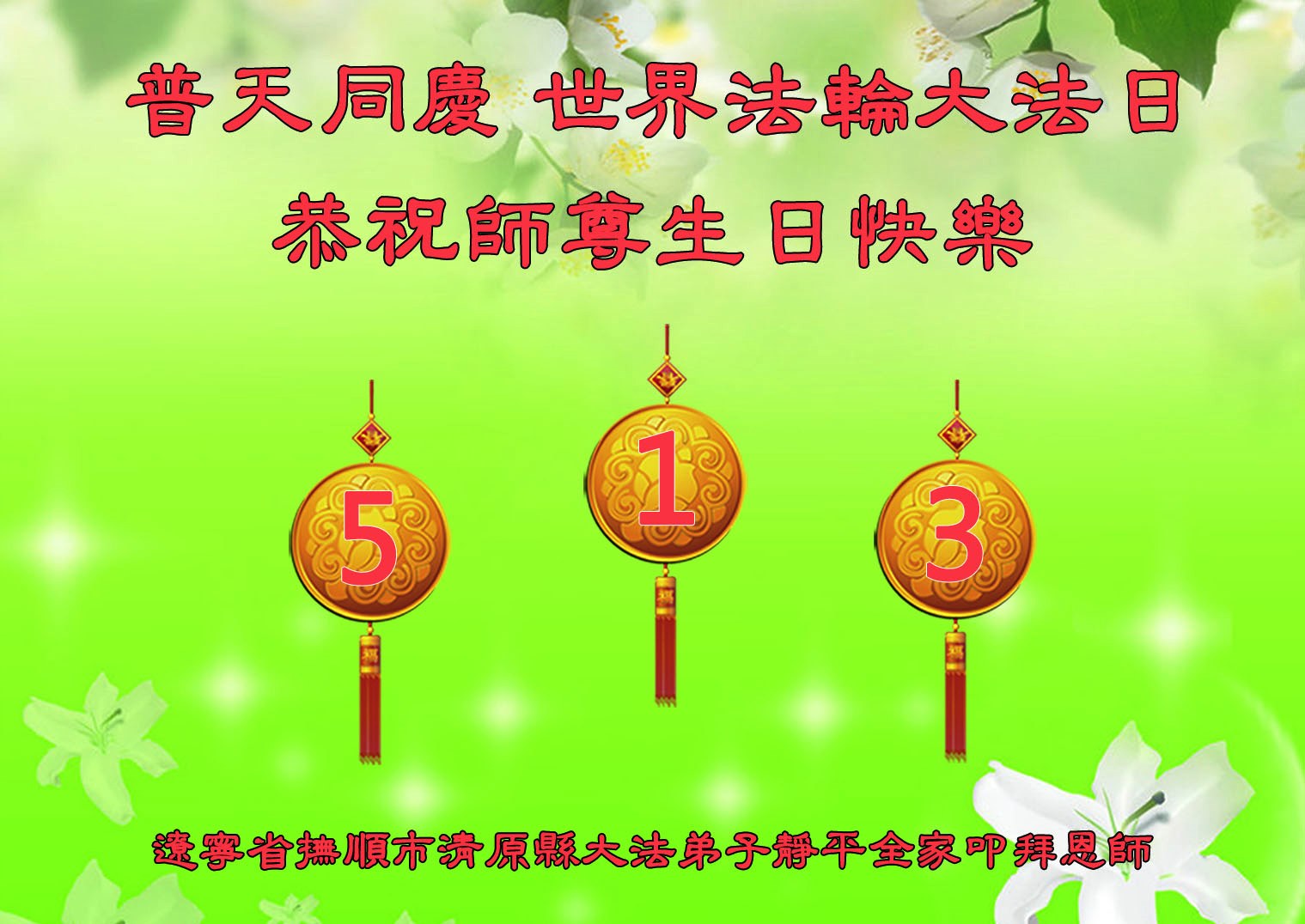辽宁省抚顺市清原县一大法弟子全家恭祝师尊生日快乐!普天同庆世界法轮大法日!