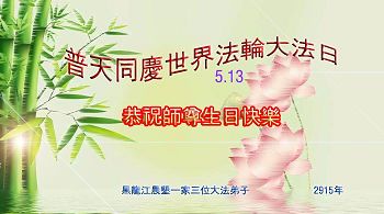 师父好,师父辛苦了! 5.13世界法轮大法日暨师父华诞,在这普天同庆的时刻即将来临之际,我们来自大陆最北端的一老年学法小组三位大法弟子祝师父生日快乐!并请师父放心,我们一定尽最大努力做好三件事,修好自己,多救众生,紧跟正法進程,跟师父回家。 黑龙江省伊春市伊春区一老年学法小组 北京大法弟子恭祝伟大师尊生日快乐!
