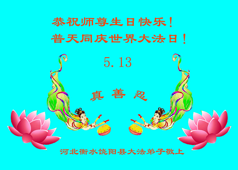 感恩师尊!法轮大法弟子是世界上最幸福的人!坚定信师信法,继续走好修炼的路,随师回家!叩拜师尊! 河北衡水饶阳县大法弟子恭祝师尊生日快乐!普天同庆世界法轮大法日!