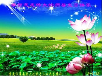 弟子们一定不辜负师父的慈悲苦度,学好法,修好自己,做好三件事,圆满随师还。叩拜师父! 重庆市沙坪坝区大法弟子祝师父生日快乐!祝贺法轮大法日!