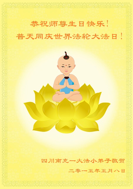 我们伟大慈悲的师尊:生日快乐! 弟子们想念师尊,感恩师尊!弟子们一定以纯净的心态,坚持不懈的做好三件事多救世人,兑现誓约回归家园。 弟子们想念师尊, 感恩师尊! 再祝师尊生日快乐! 弟子们同贺第十六届世界法轮大法日! 成都一学法小组大法弟子及新弟子跪拜 2015年5月9日9:45 两位东北老弟子、两位宁夏新弟子恭祝师尊生日快乐!